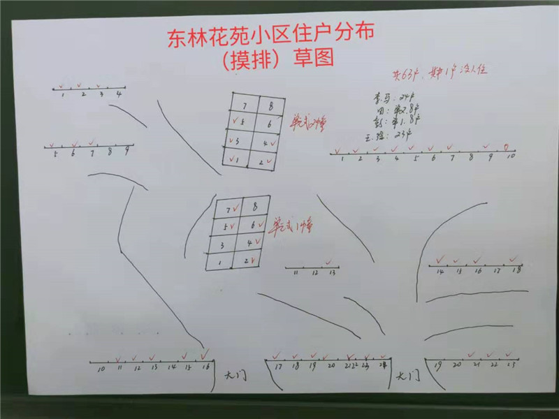 东林花苑小区是师宗县统计局的一个疫情防控网格责任片区。此小区是属“三五”小区,为认真做好该小区疫情防控工作,师宗县统计局迅速行动,快速准确摸清小区住户情况,简单绘制一张“小区住户分布(摸排)草图”,印发至综合组、值班组、摸排组、消毒组,进一步划分职责,责任到组到人,以绣花般的精细和韧性,织起一张坚不可摧的防疫安全网。