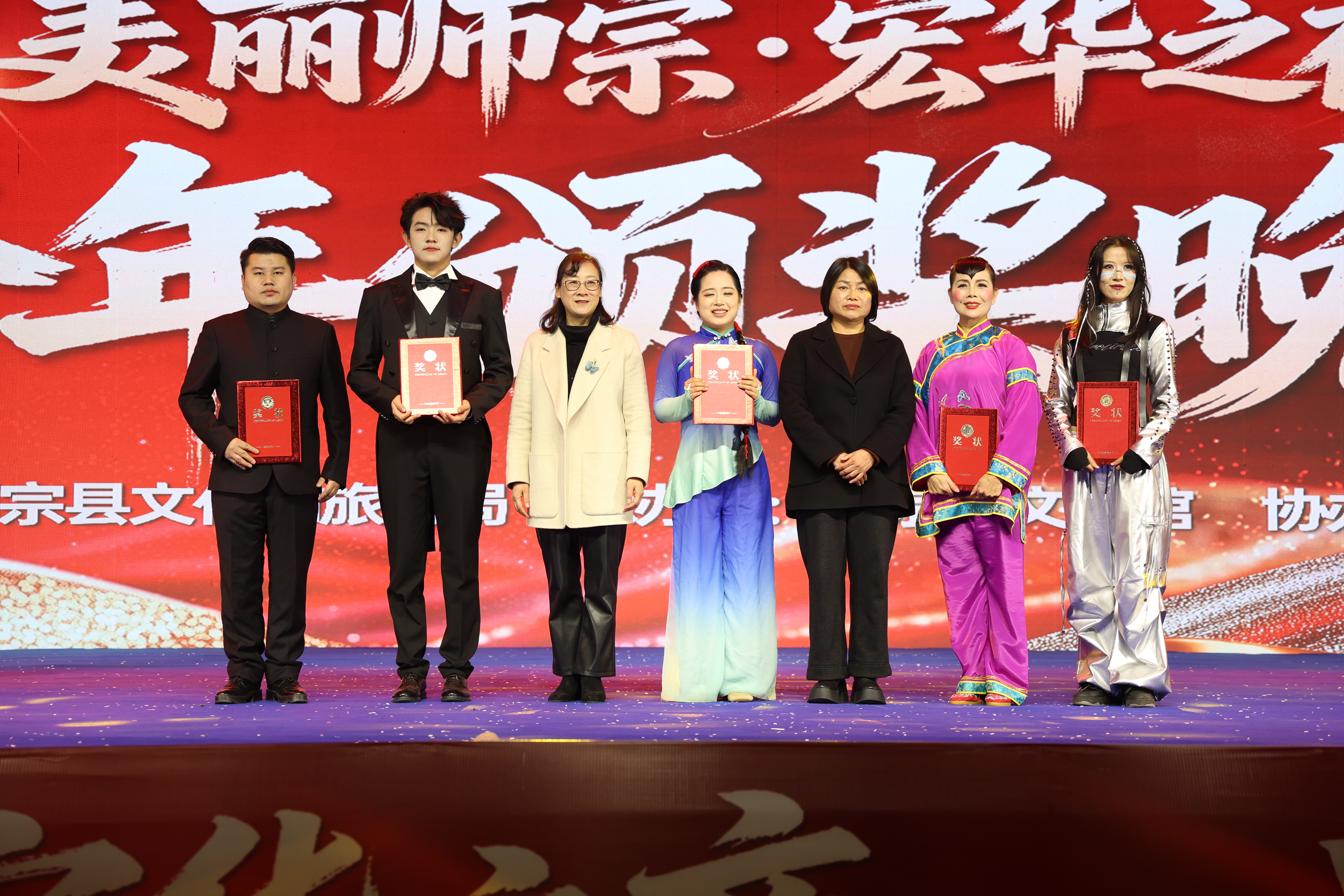 晚会还特别穿插了2025年“美丽师宗”系列文化活动的颁奖环节。该活动涵盖歌唱、器乐、舞蹈三大类别,历时一个月,吸引了全县900余名文艺爱好者参与,充分展现了基层群众的文化活力与艺术风采。
