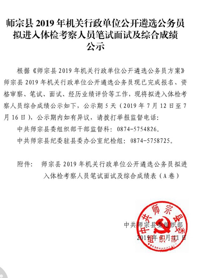 师宗县2019年机关行政单位公开遴选公务员拟进入体检考察人员笔试面试及综合成绩公示