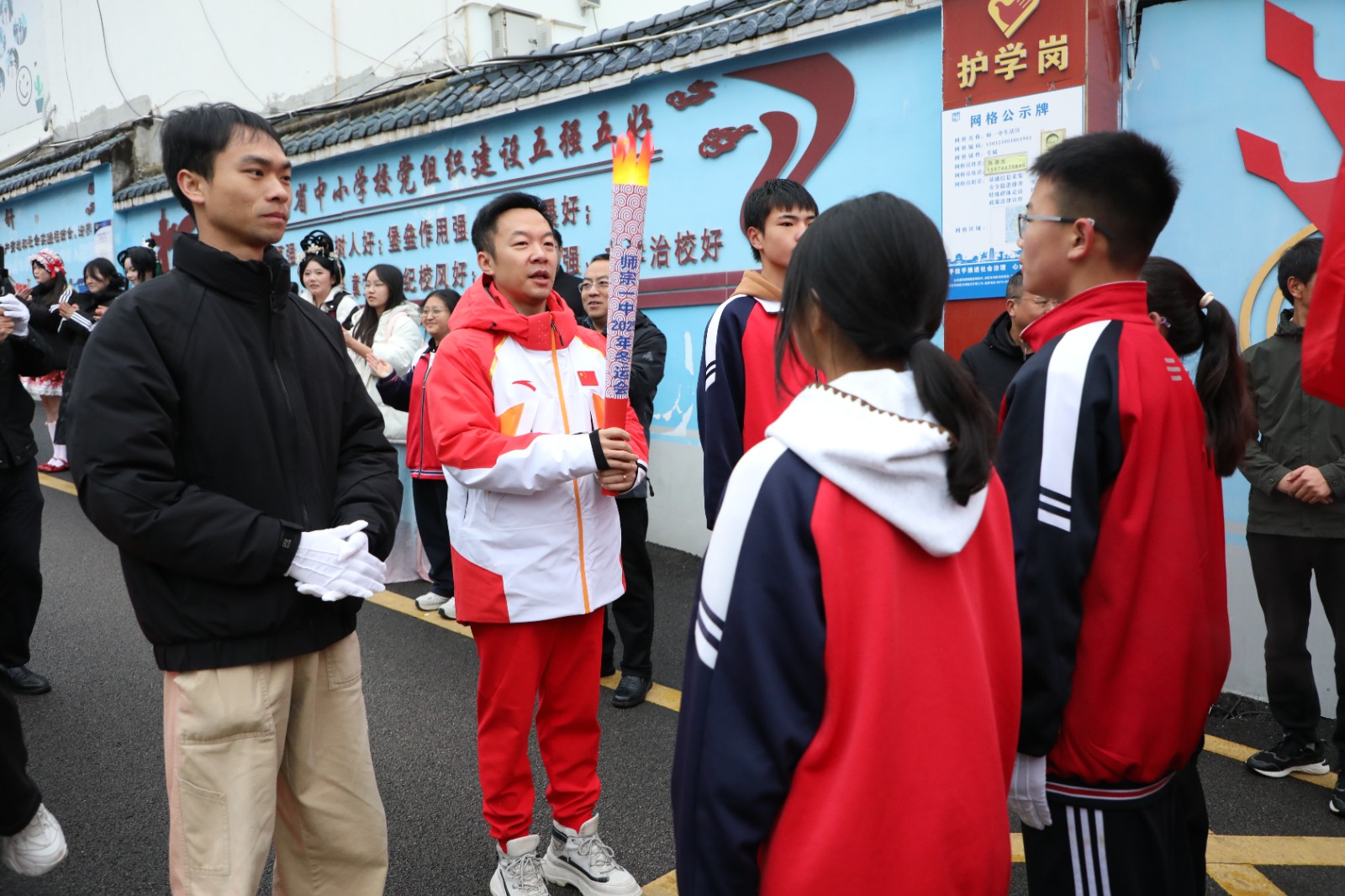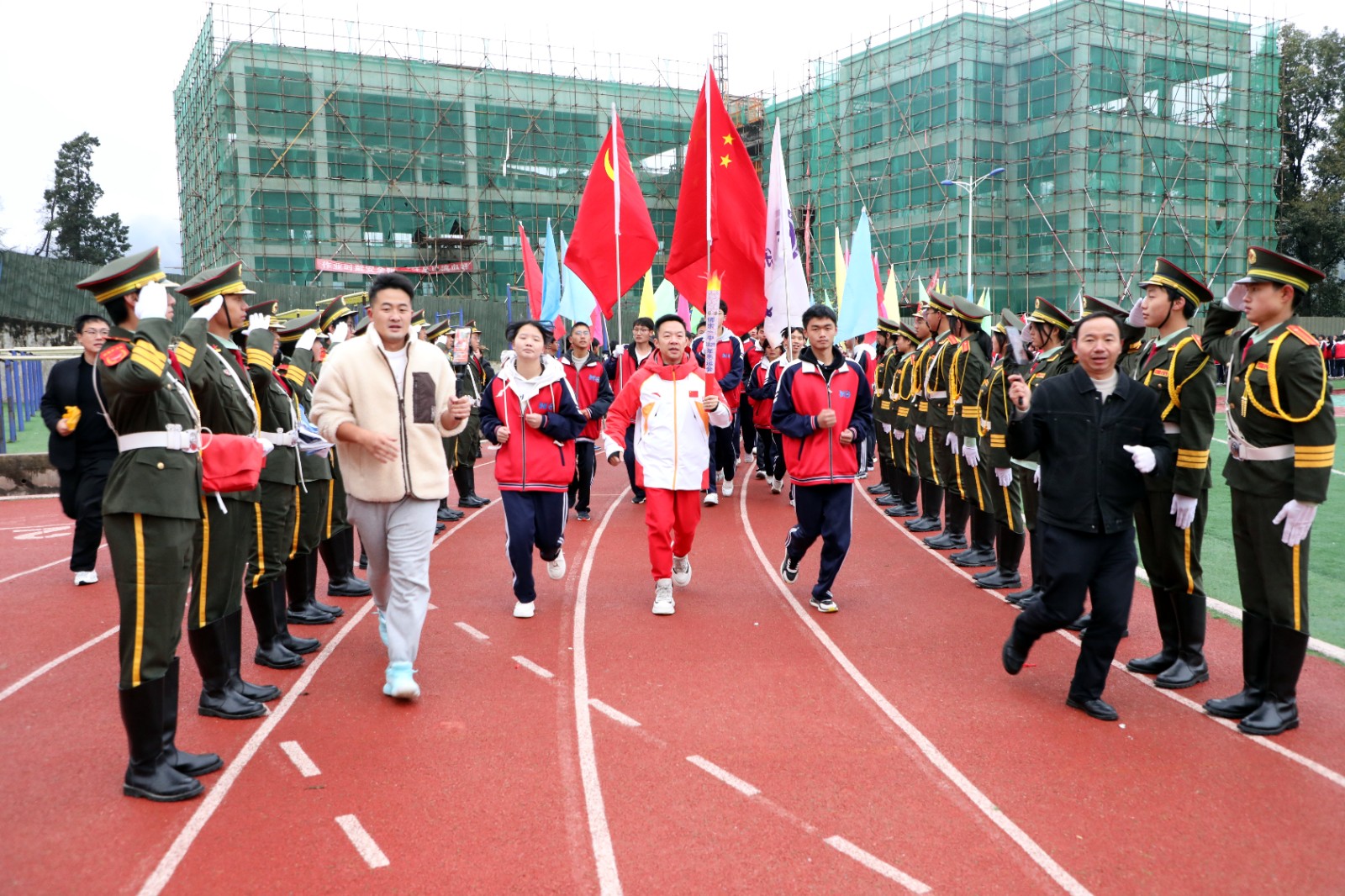 运动会以庄严的火炬传递仪式拉开序幕。清晨7时30分,师宗县第一中学校门口早已欢腾起来,学生们整齐列队,形成一条热情的长龙,翘首以盼共同迎接运动会火炬的到来。作为最后一棒火炬手,郭伟阳面带微笑,步伐坚定地从校内火炬手手中接过火炬,在师生们的欢呼声中完成了接力,象征着体育精神的接续传承,点燃了运动会的激情。