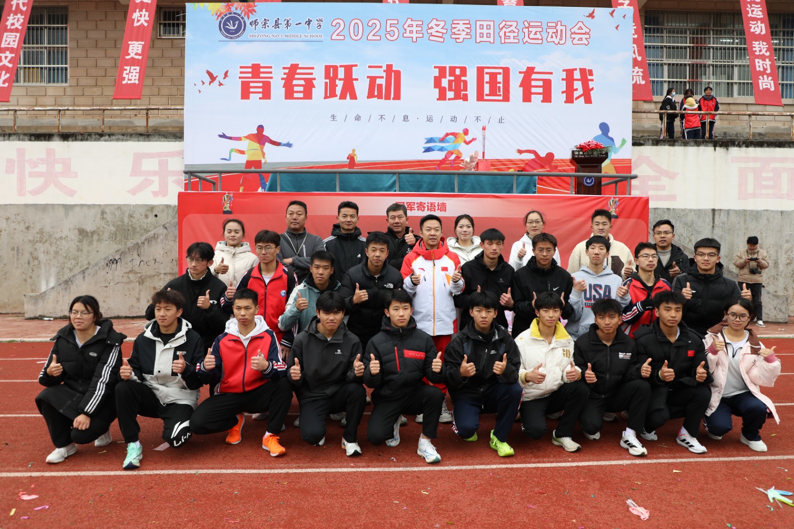 郭伟阳还在开幕式现场观看了同学们的精彩入场,并登台作励志演讲,鼓励同学们在运动中锤炼意志,在奋斗中实现价值。仪式结束后,郭伟阳与学校负责人、体育组教师及体育特长生合影留念,用镜头定格了这一难忘时刻。