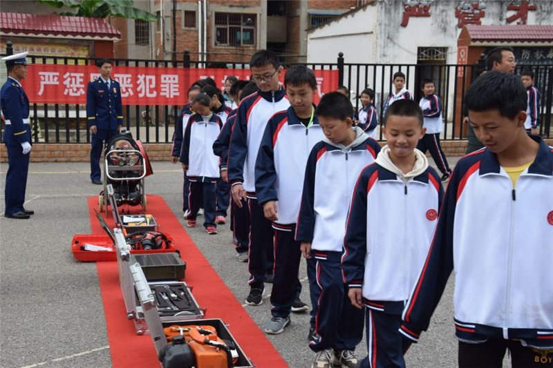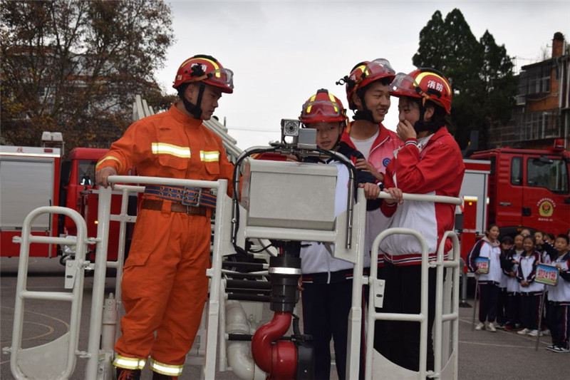 在活动现场,消防救援大队将常用的消防装备器材摆出,供大家参观,并讲解各类器材的用途,使大家进一步了解消防、关注消防。学生代表还体验了部分灭火装置等设备设施。